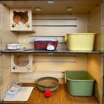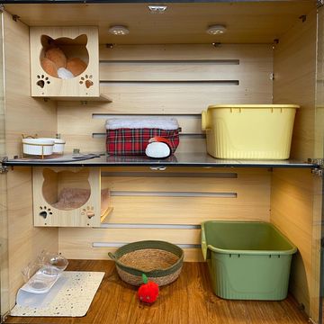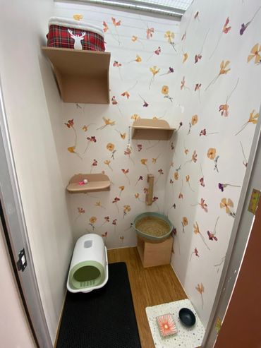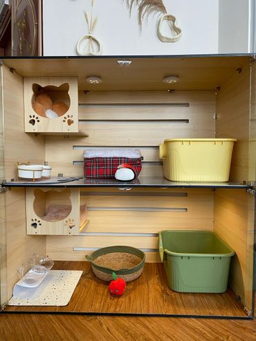 0.8m² space floor suits your lone ranger cat as it accommodates one cat per room. Each suite is fully equip with litter box, perch and other basic necessities.